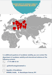 Academic mobility of university students is carried out both on the basis of international agreements (international programs, memoranda and cooperation agreements, exchange and scholarship programs) with foreign partner universities, and on the basis of agreements with domestic and foreign universities: University of Economics (Bydgoszcz, Poland), Udmurt State University, Almetyevsk State Petroleum University, Tambov State Technical University, Samara State Social Pedagogical University, Orenburg State Pedagogical University, South Ural State Humanitarian Pedagogical University, Kalmyk State University named after. B.B. Gorodovikova, Bashkir State Pedagogical University named after. M. Akmully, Ural State Pedagogical University, Moscow State University of Communications and Informatics, Yerevan State Linguistic University. V. Bryusov, Belgorod State National Research University, West Kazakhstan University named after. M. Utemisov, Aktobe Regional University named after. K. Zhubanova, Institution “Baishev University”, Aktobe, Kokshetau University named after Abai Myrzakhmetov, Kokshetau, etc. Under the incoming academic mobility program, the following were invited to give lectures at our university: