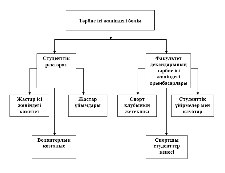 - Тәрбие жұмысының негізгі бағыттары бойынша бағдар беруге (Тәрбие және әлеуметтік жұмыс жөніндегі бөлім секторлары, декан орынбасарлары, академиялық топтардың кураторлары, студенттік өзін-өзі басқару ұйымдары);