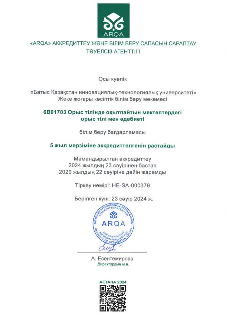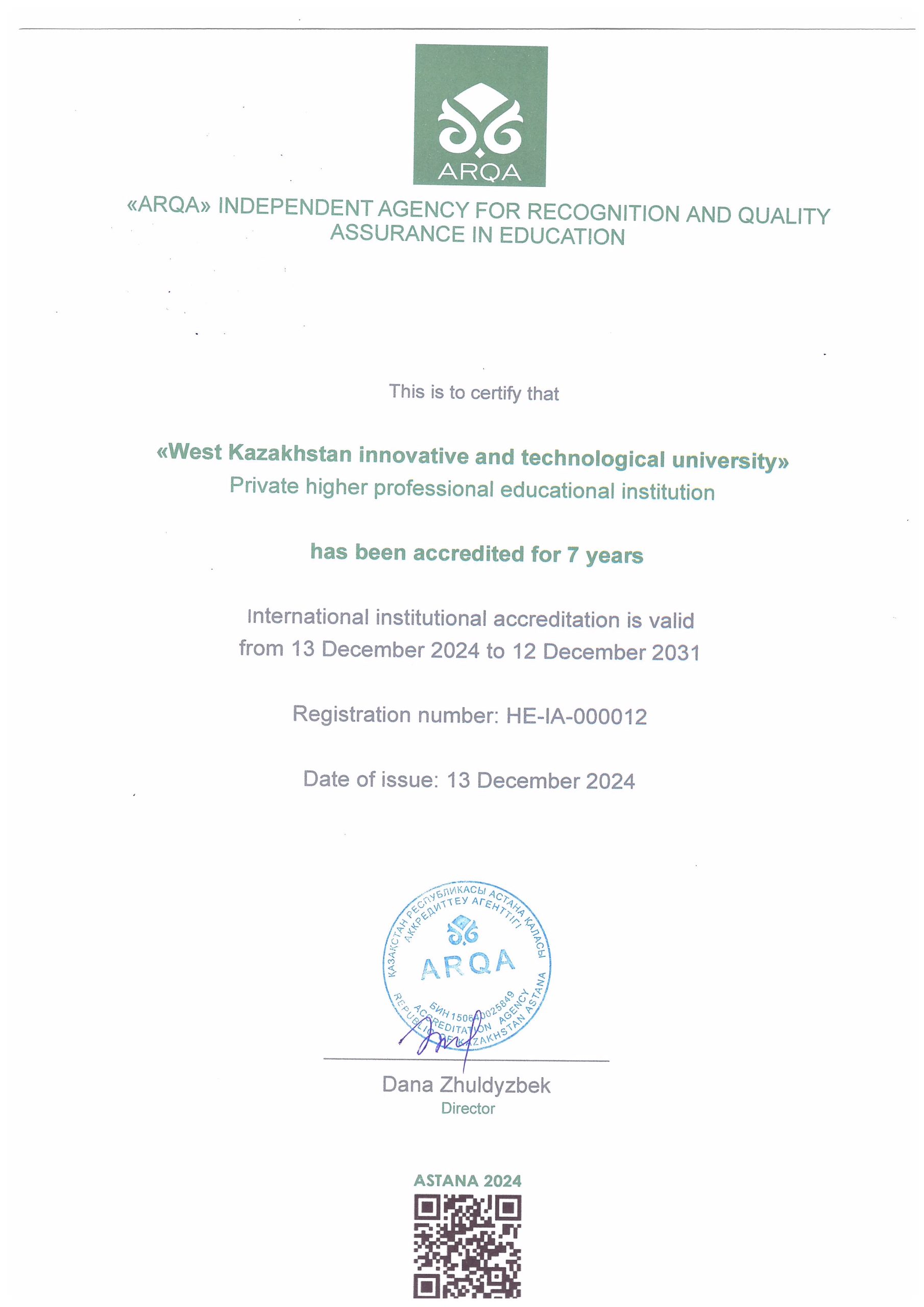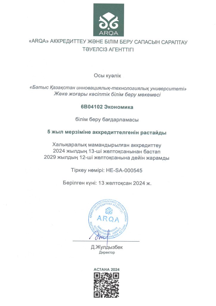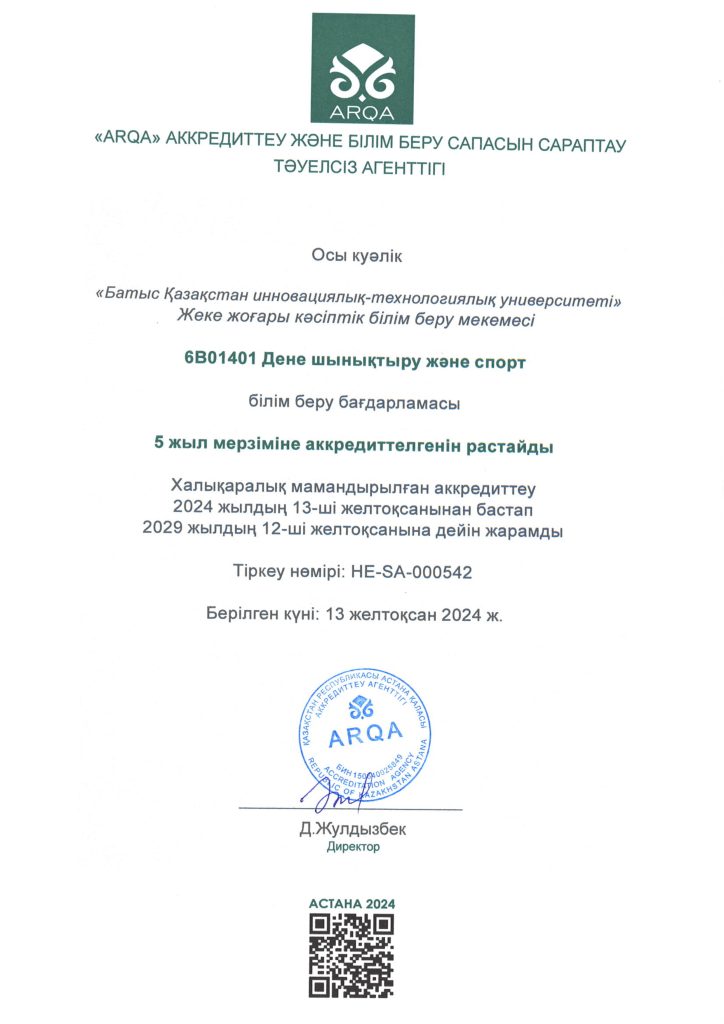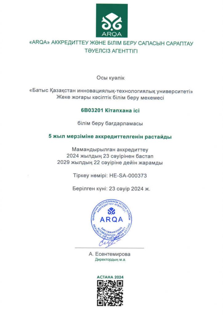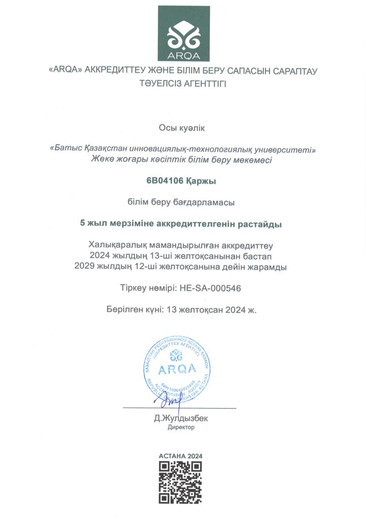 ARQA Аккредиттеу Кеңесінің 11.12.2024 ж. шешімімен Батыс Қазақстан инновациялық-технологиялық университеті 7 жылға аккредиттелді.