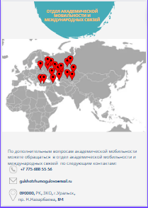 Академическая мобильность обучающихся университета осуществляется как на основании международных договоров (международные программы, меморандумы и договоры о сотрудничестве, обменные и стипендиальные программы) с зарубежными вузами-партнерами, так и на основании договоров с отечественными и зарубежными вузами: Университет экономики (г.Быдгощ, Польша), Удмуртский государственный университет, Альметьевский государственный нефтяной университет, Тамбовский государственный технический университет, Самарский государственный социально-педагогический университет, Оренбургский государственный педагогический университет, Южно-Уральский государственный гуманитарно-педагогический университет, Калмыцкий государственный университет им. Б.Б.Городовикова, Башкирский государственный педагогический университет им. М. Акмуллы, Уральский государственный педагогический университет, Московский государственный университет связи и информатики, Ереванский государственный лингвистический университет им. В.Брюсова, Белгородский государственный национальный исследовательский университет, Западно-Казахстанский университет им. М. Утемисова, Актюбинский региональный университет им. К.Жубанова, Учреждение «Баишев университет», г.Актобе, Кокшетауский университет имени Абая Мырзахметова, г.Кокшетау и др.
