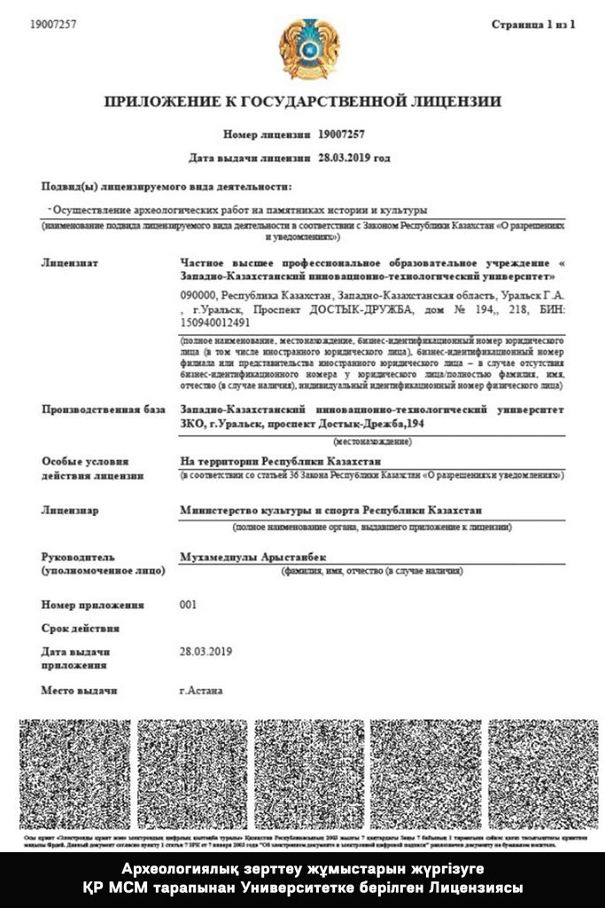 Батыс Қазақстан инновациялық-технологиялық университетіне 2019 жылы 28 наурызында Қазақстан Республикасының территориясында орналасқан тарих және мәдениет ескерткіштерінде археологиялық және (немесе) ғылыми-реставрациялық жұмыстар жүргізуге рұқсат беретін ҚР Мәдениет және спорт министрлігі тарапынан №19007257 1 деңгейлі Лицензия берілді.