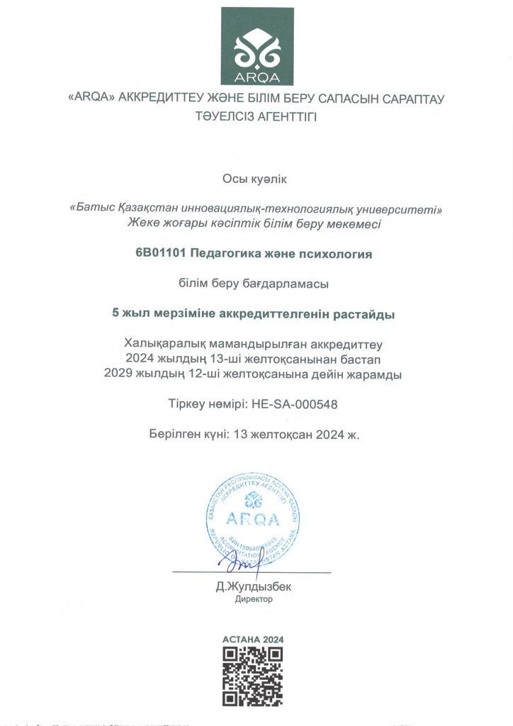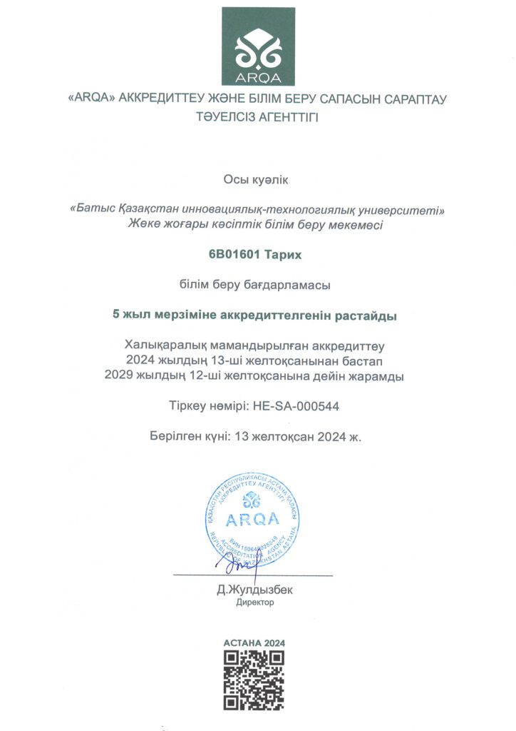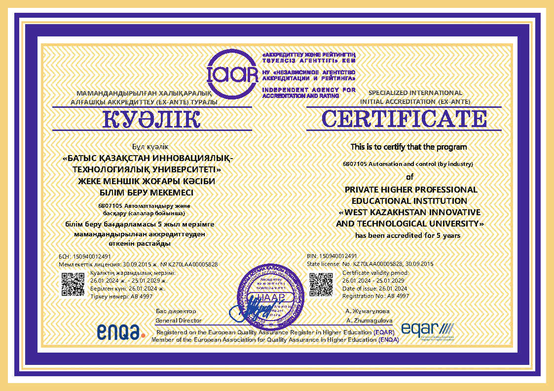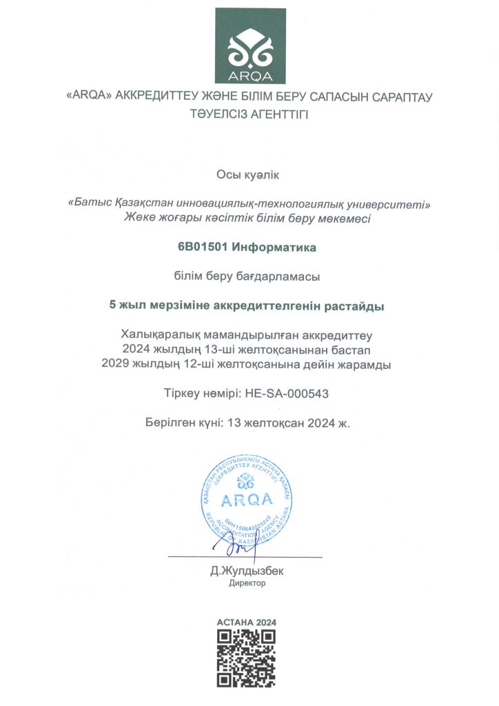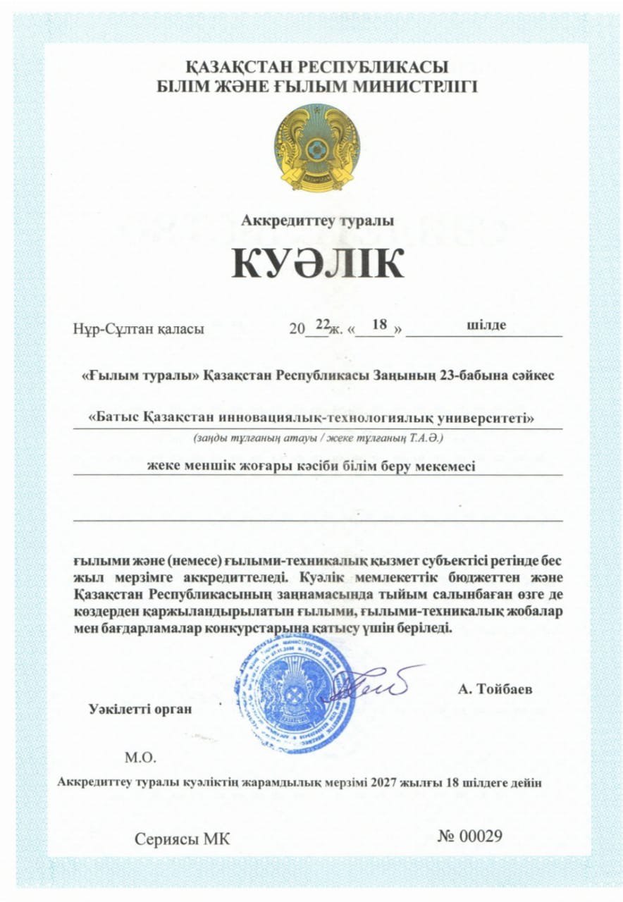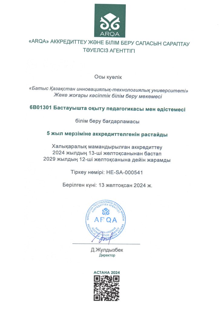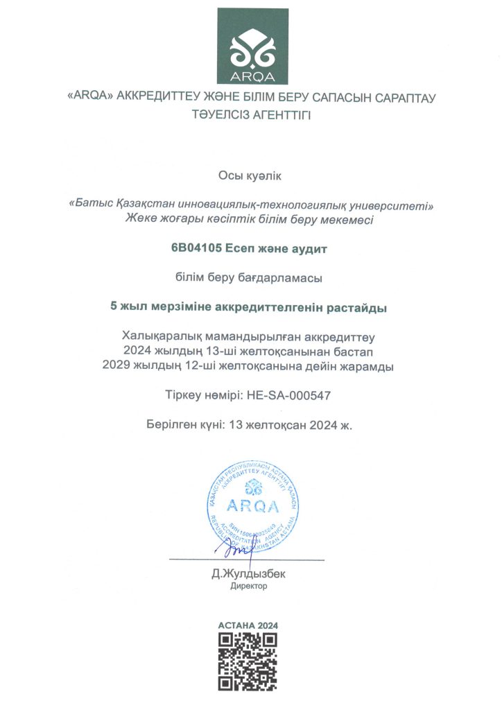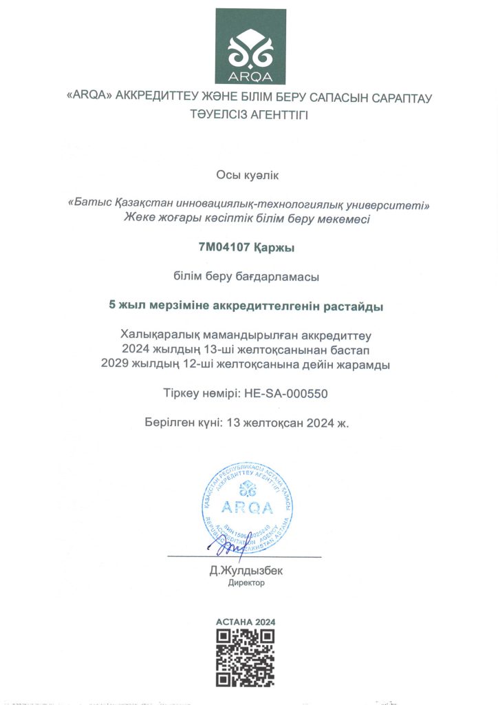 ARQA Аккредиттеу Кеңесінің 11.12.2024 ж. шешімімен Батыс Қазақстан инновациялық-технологиялық университеті 7 жылға аккредиттелді.