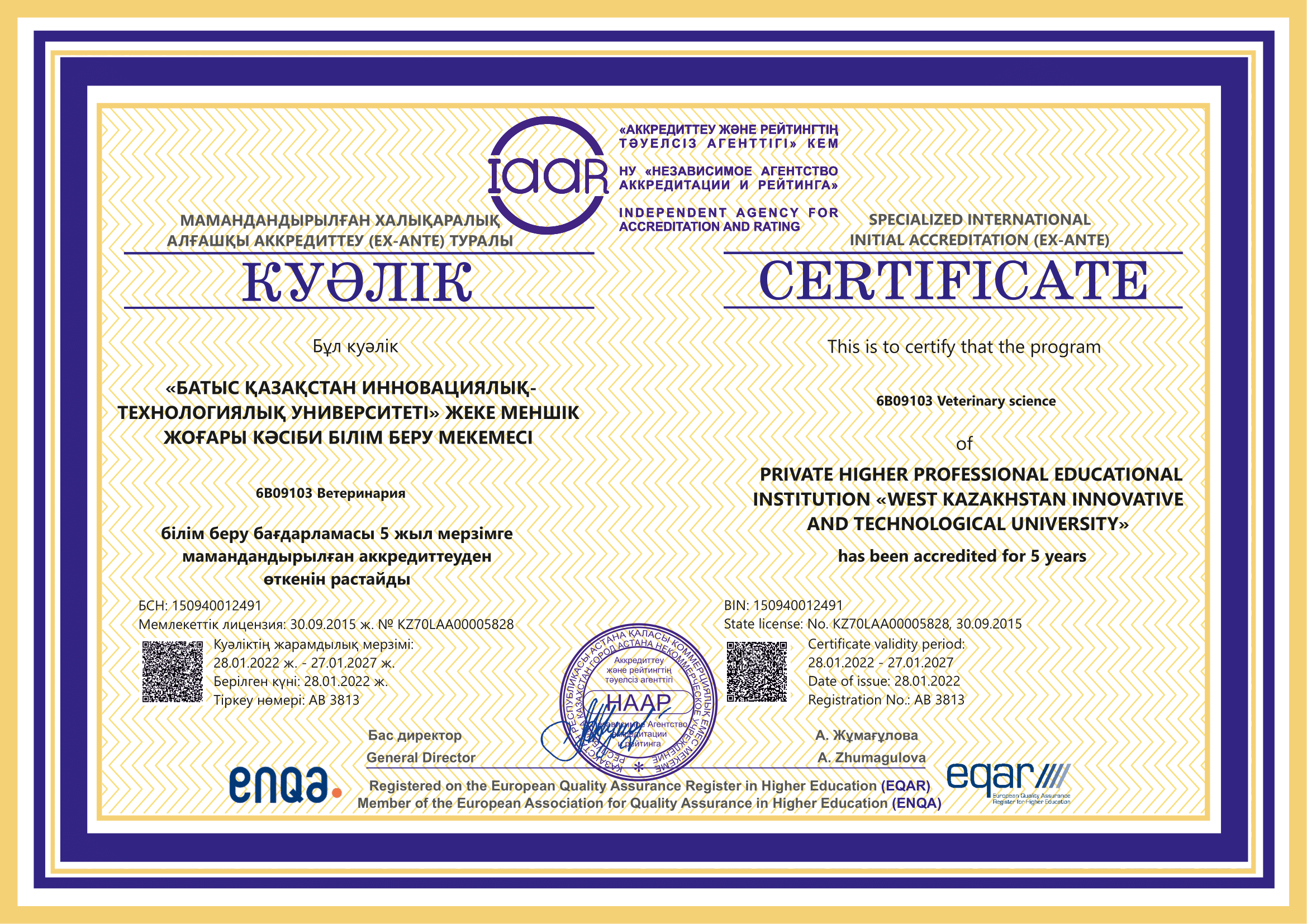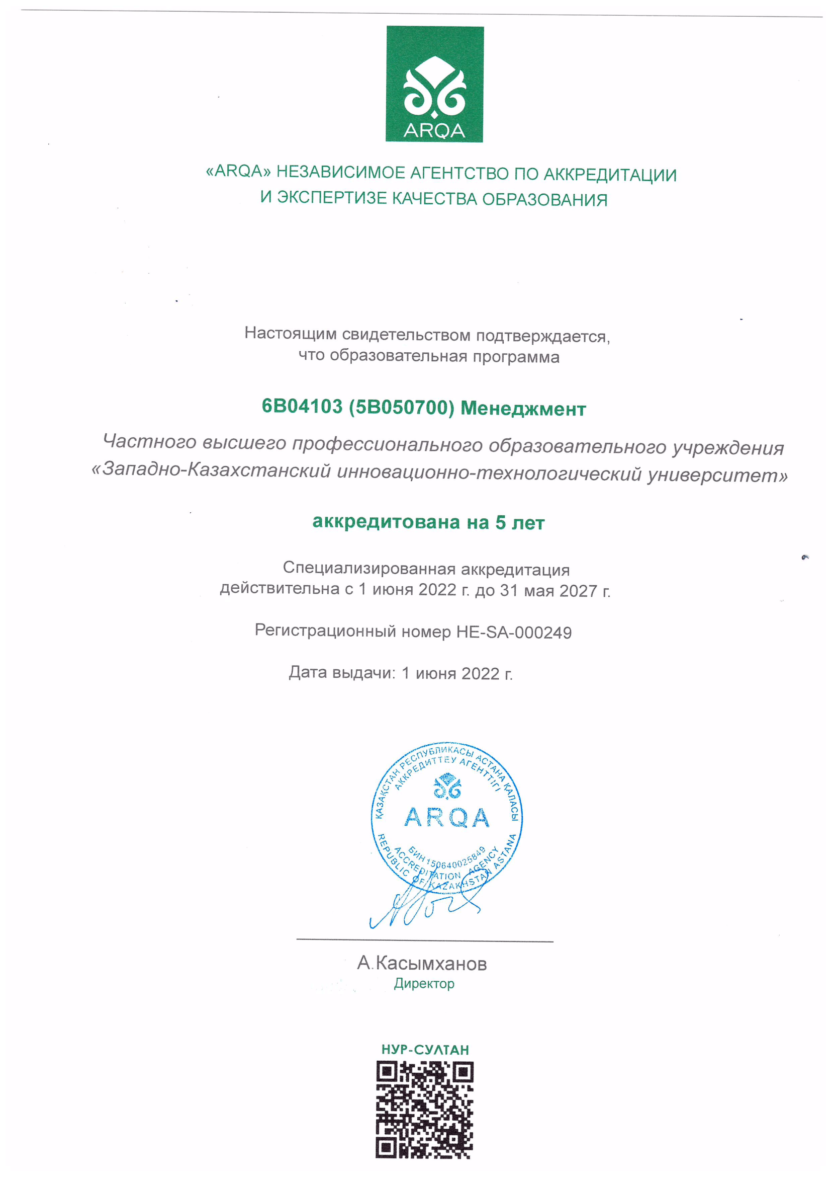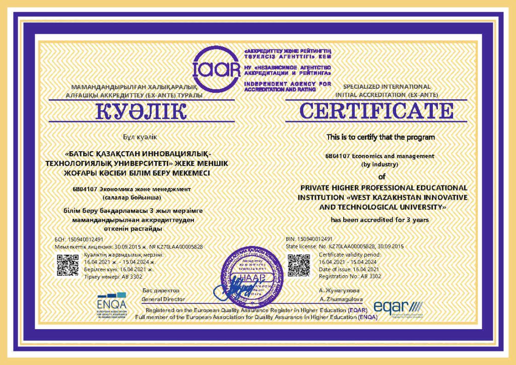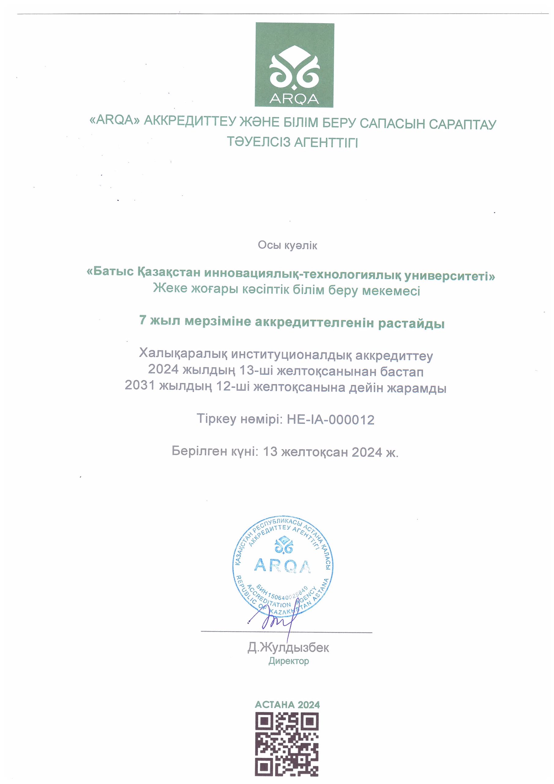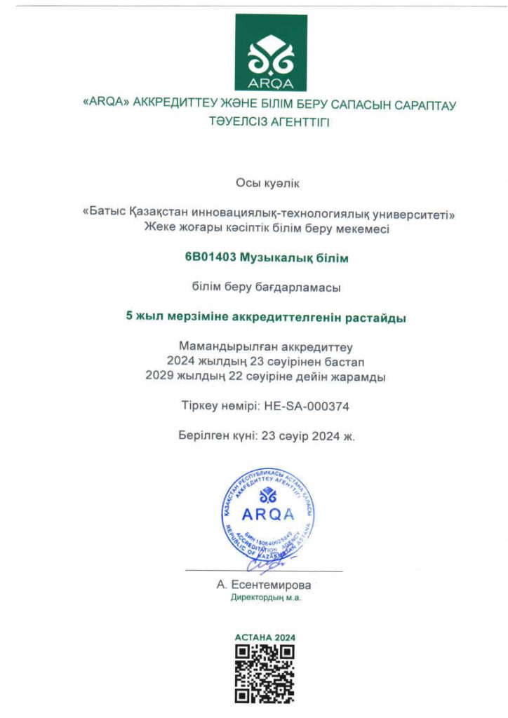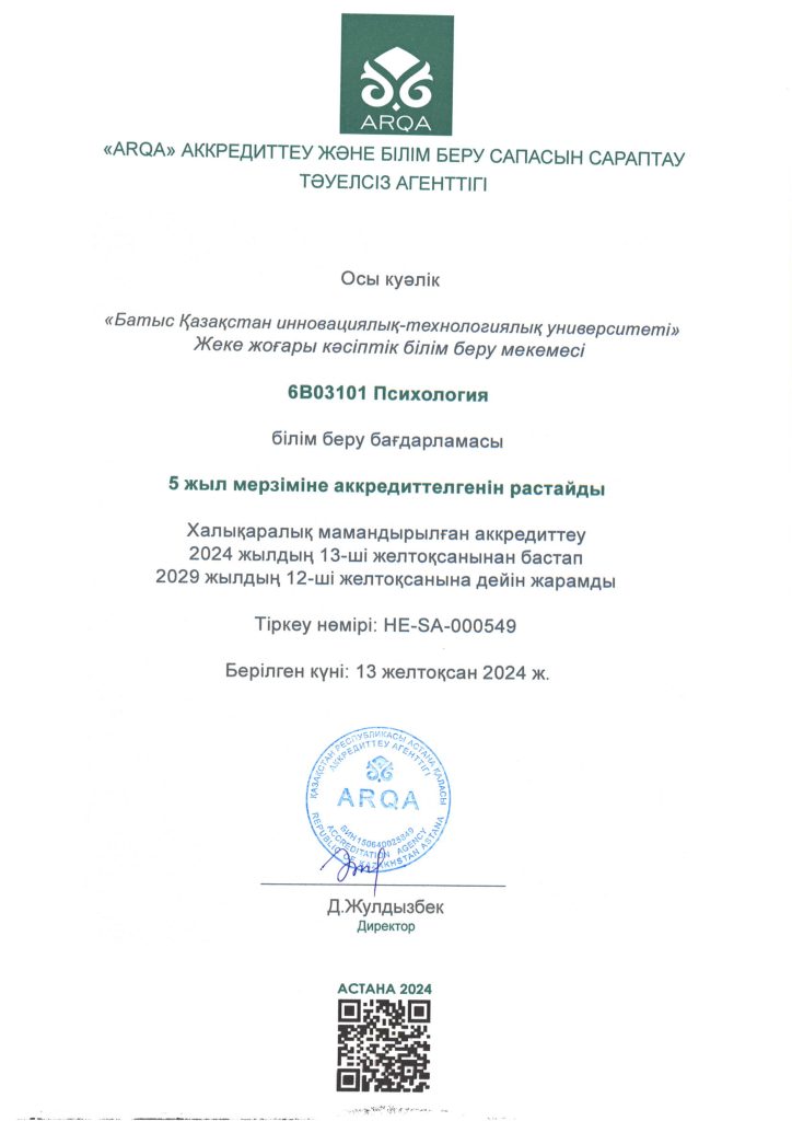 ARQA Аккредиттеу Кеңесінің 11.12.2024 ж. шешімімен Батыс Қазақстан инновациялық-технологиялық университеті 7 жылға аккредиттелді.